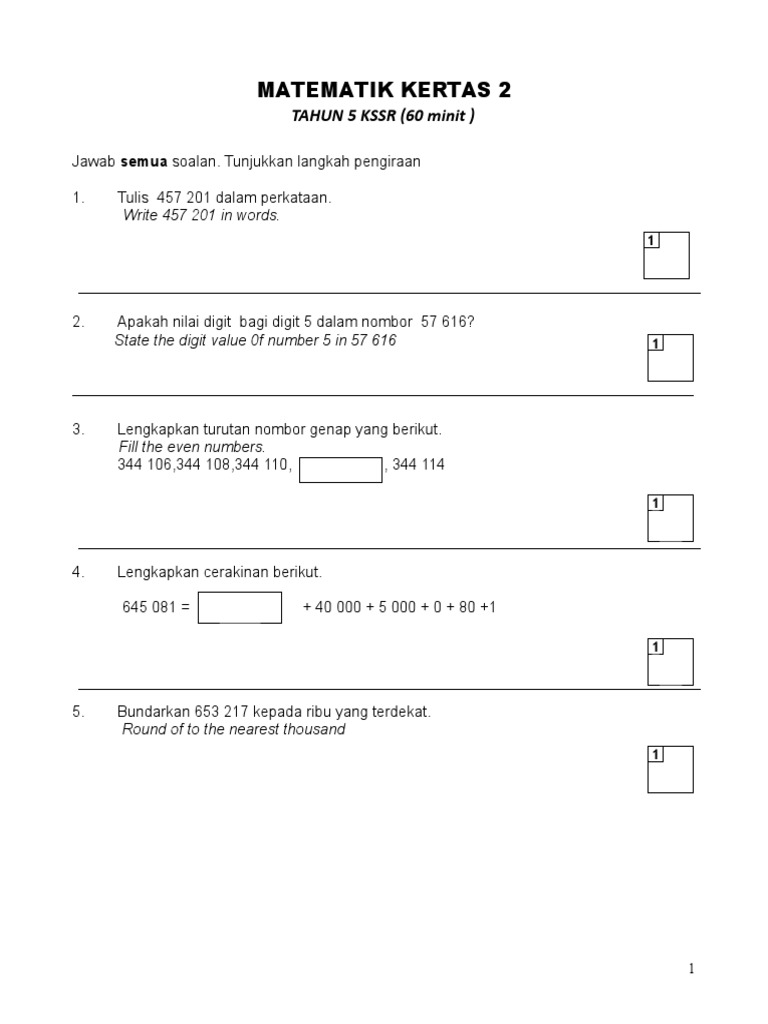 Soalan Matematik Tahun 5 Kssr. Mengandungi beberapa set soalan untuk kemudahan guru & pelajar membuat latihan, . Nombor sehingga 1 000 000;